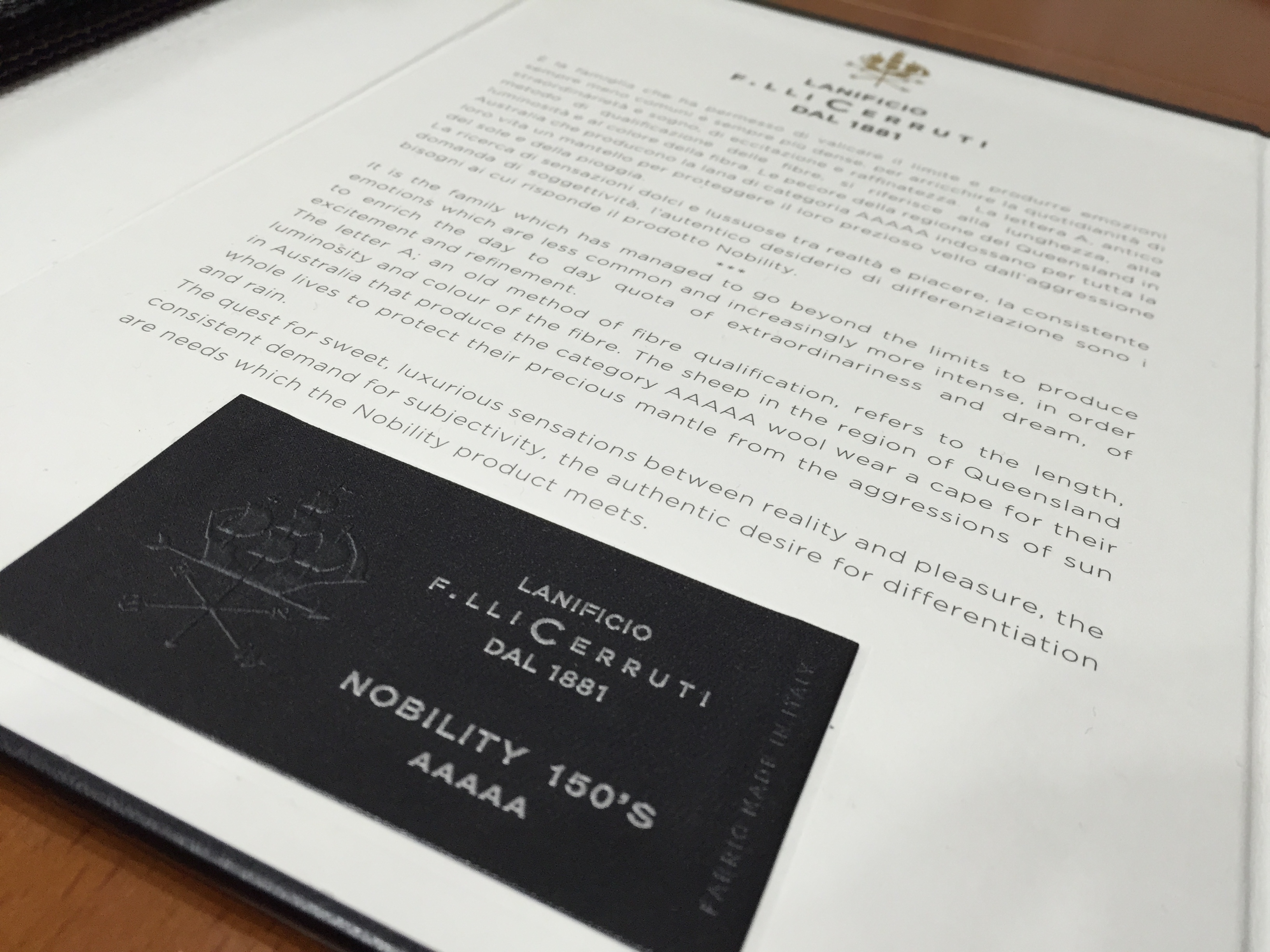 1881年にイタリア、ビエラ地方(イタリア北部のとても有名な生地の一大産地、アルプスから流れるきれいな水が良質な素材を生むのです)にて1881年創業。