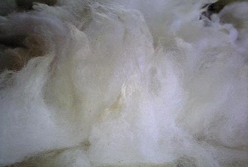 羊から刈り取られ、洗浄され綿のようなフカフカな状態。