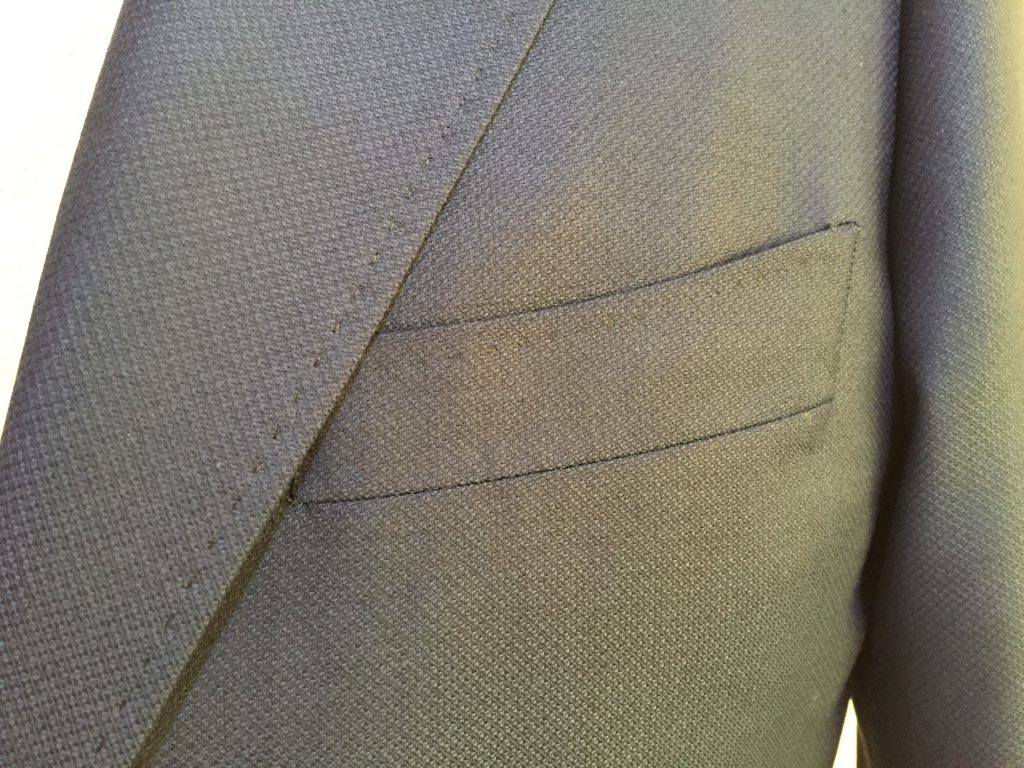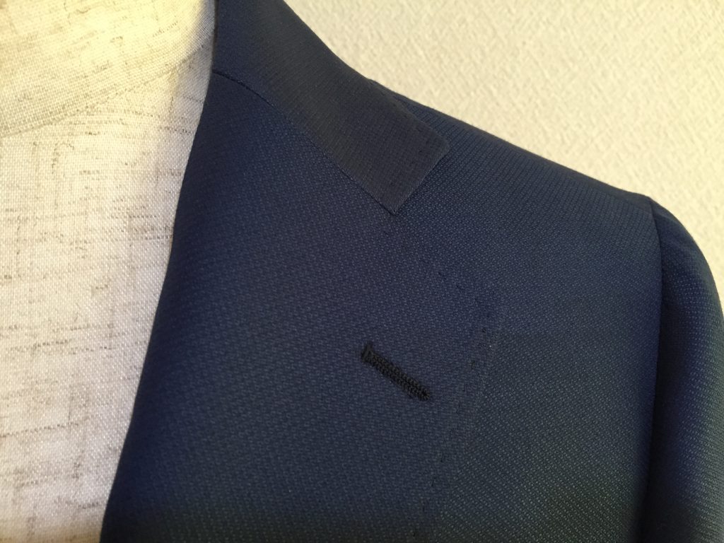 まず、エリは上衿(カラー)、下衿(ラペル)、そのつなぎ目をゴージ、社章などをつけるところをフラワーホールといいます。あと、衿にポチポチ入れているのが機械式でAMFステッチ、手作業だとハンドステッチ。