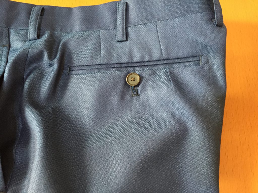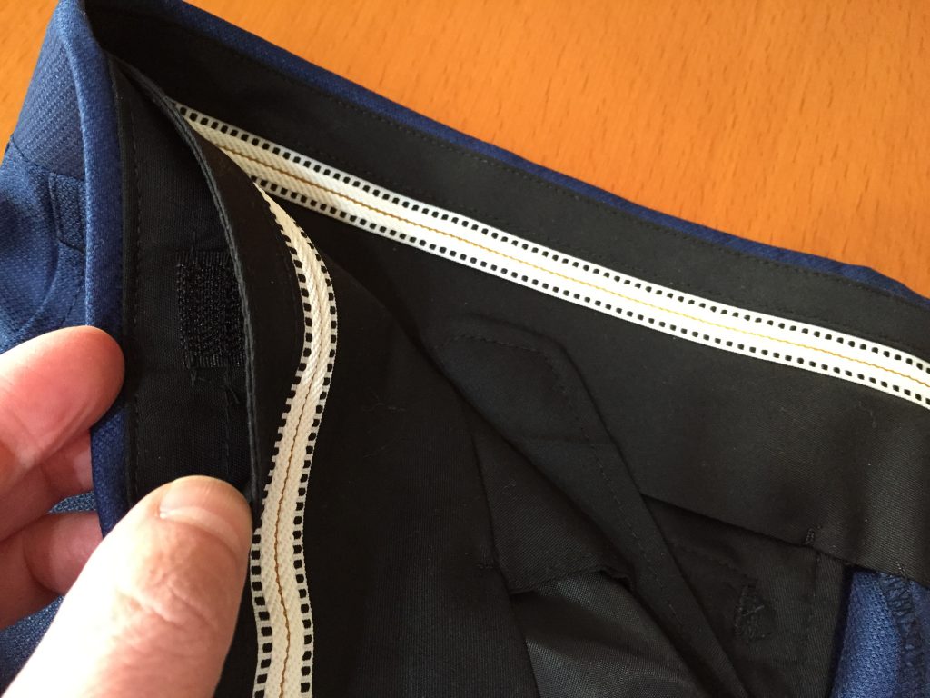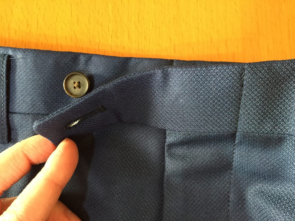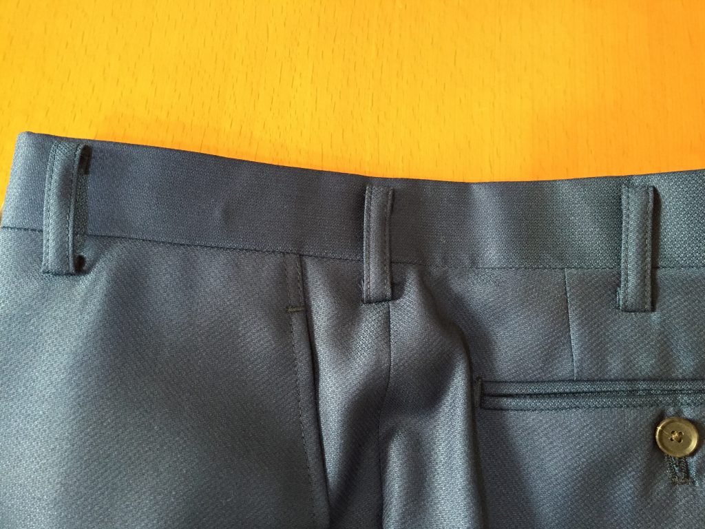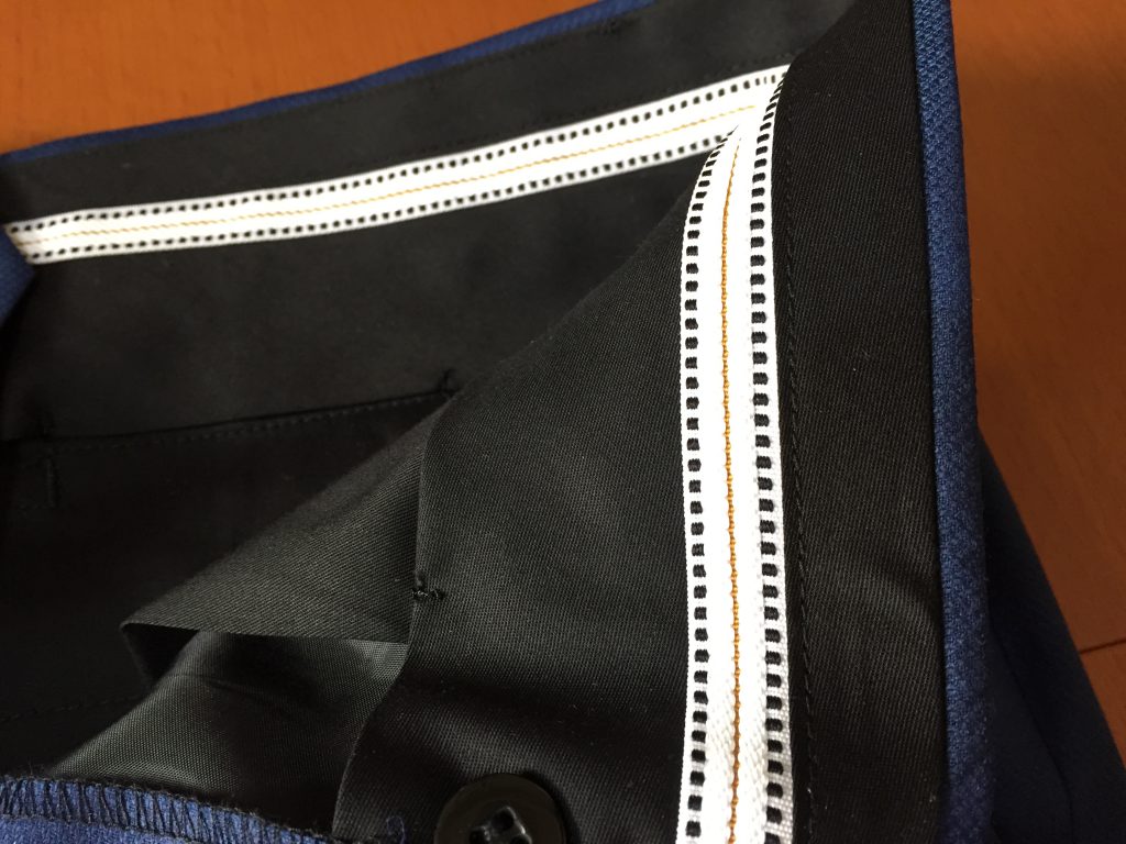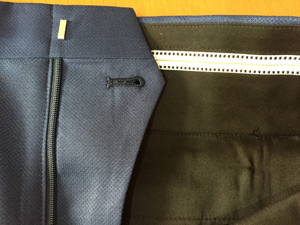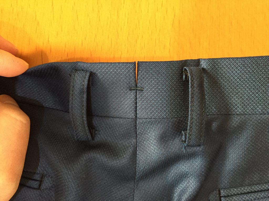 ベルト通しのことを「ループ」。腰のパーツを切り替えているのを「オビ」といいます。業界では「ウエスマン」なんて呼ぶ人もいます。ちなみにベルトレスが標準のモーニングバンツなどはこのオビが無く一枚で仕上げる時があります。