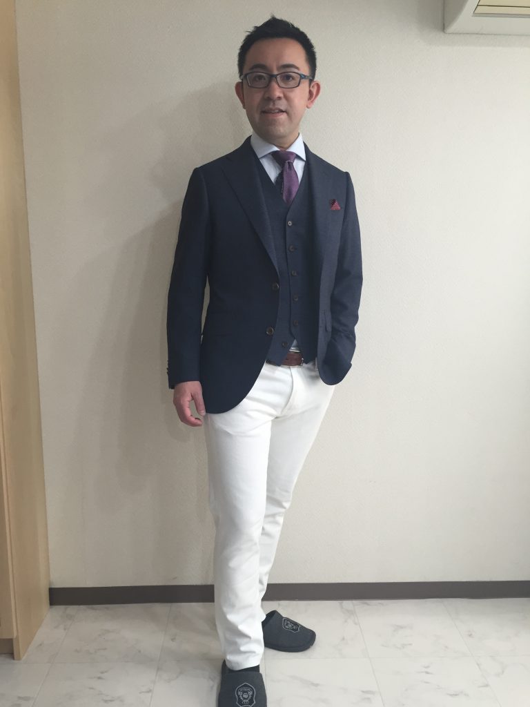 タイドアップにジャケットとベスト(ジャケットインナーなのでジレとは呼びません)の組み合わせそのままに白パンツにしました。