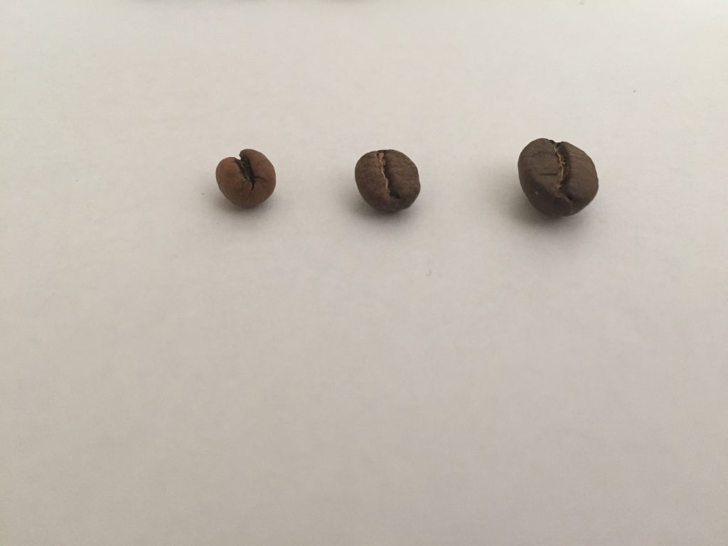 左から南米ブラジルのピーベリー、ブルンジのブルボンという品種、右がインドネシアのティピカという品種のいずれもアラビカ豆