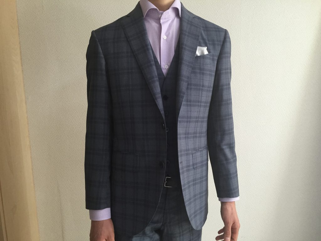 上質なグレイベースのチェック柄を採用し、重くなくそして遊びでもなく、そしてスリーピースにすることによって、誠実さも表現しています。