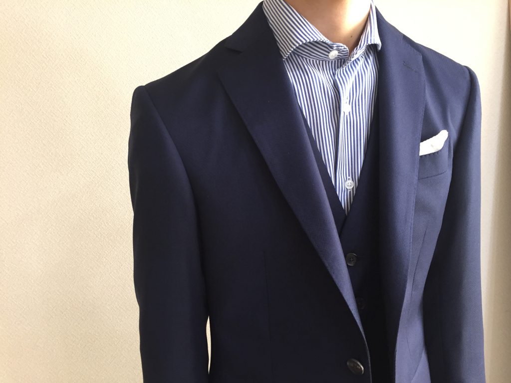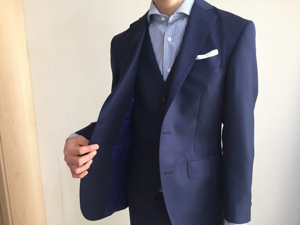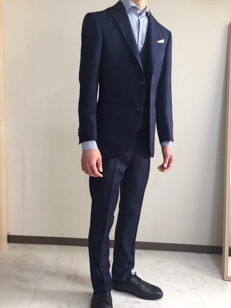 表面が実にキレイな上質ネイビーでスリーピーススーツにしたてました。