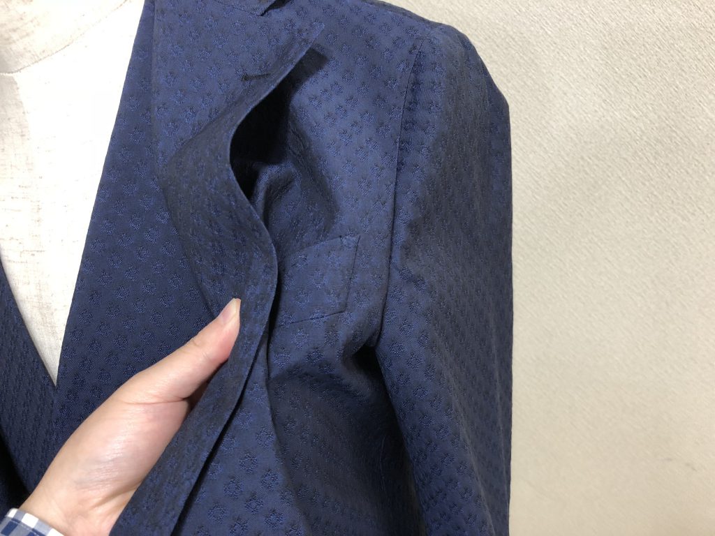 肩パットを入れないのは今まで通りですが、今回は胸元に入れている芯地まで取り去ってしまう作りにしています。