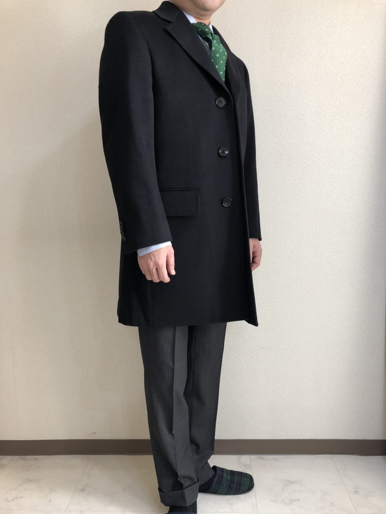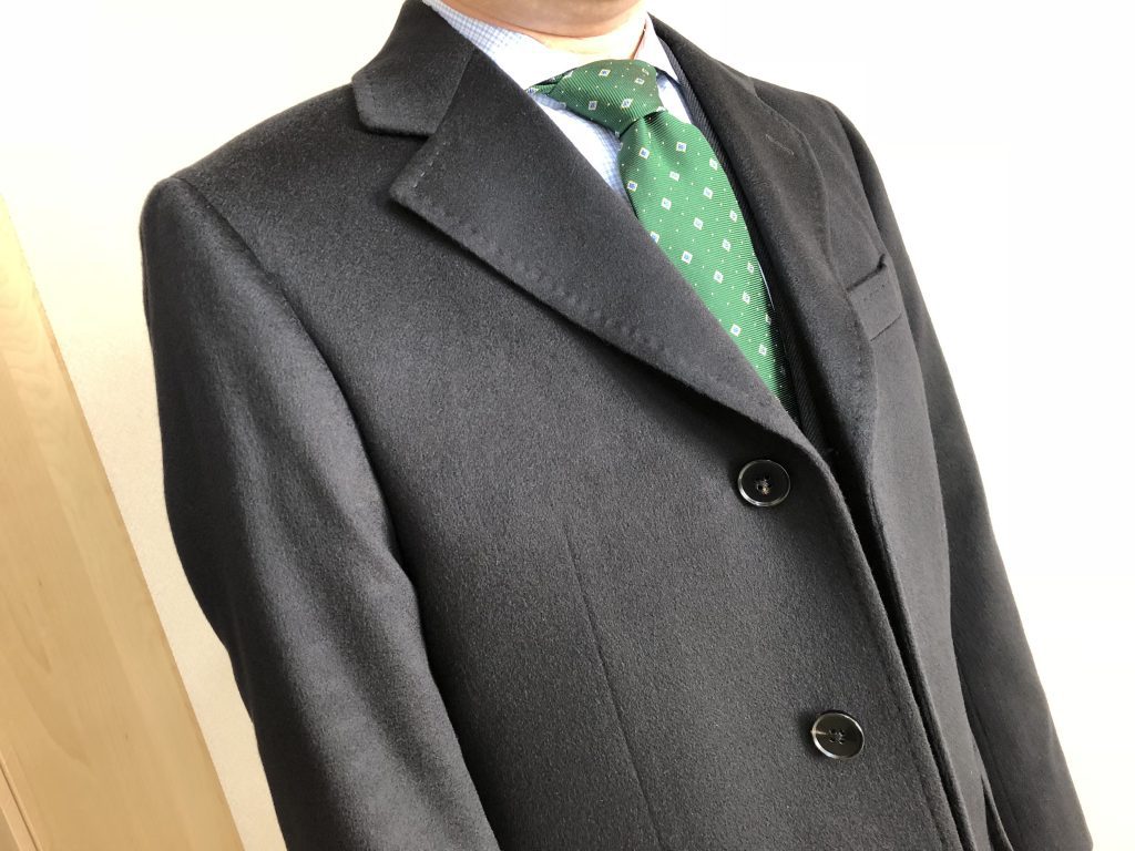 コートは立場を表現するために、カシミア100%をチョイスしたチェスターコート。
