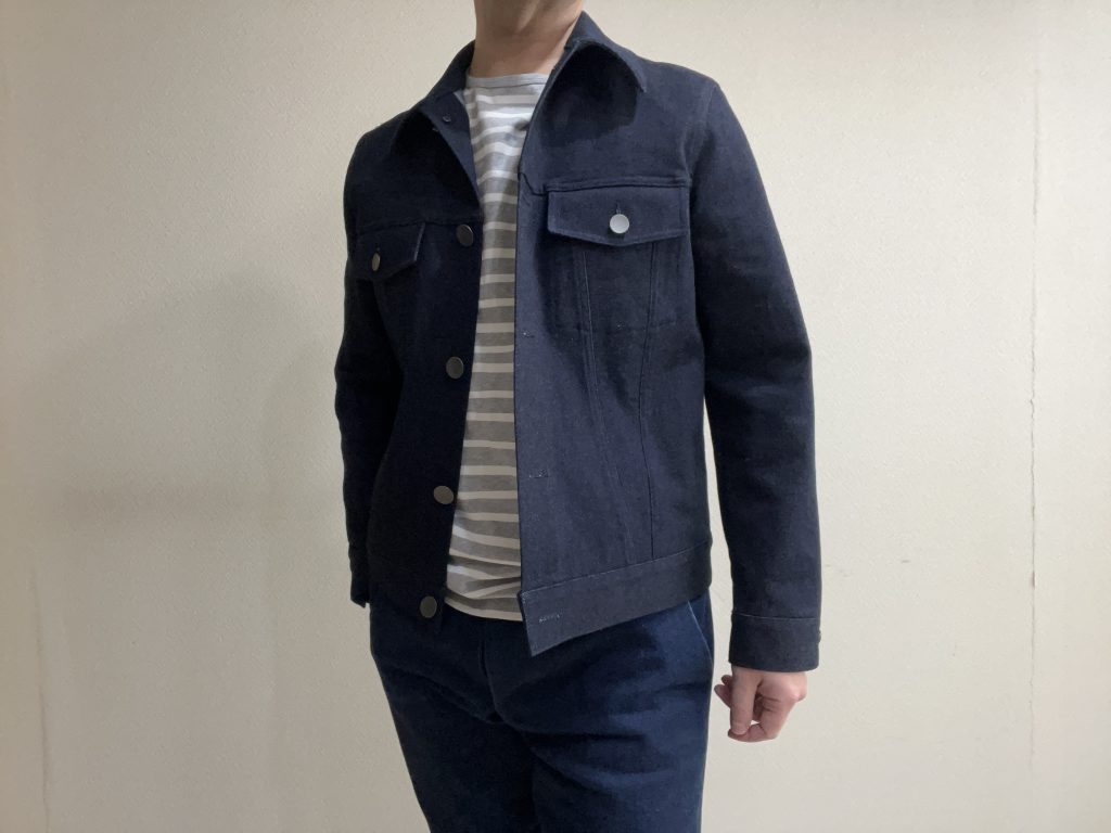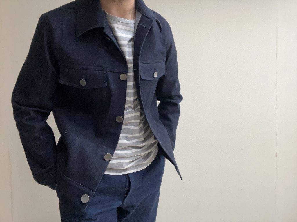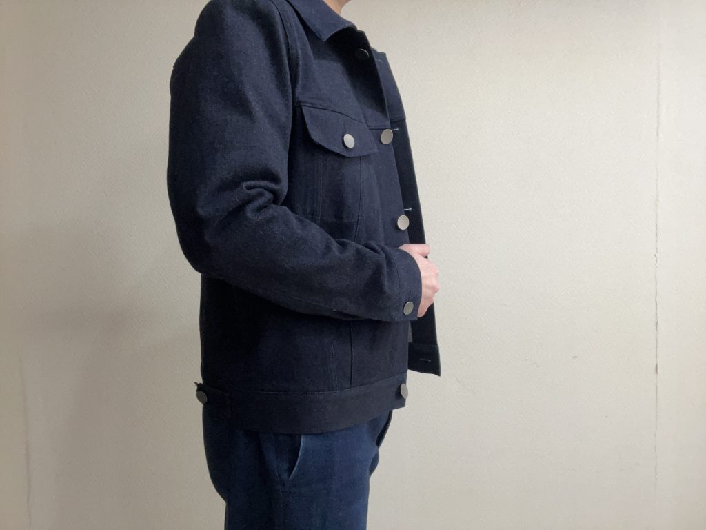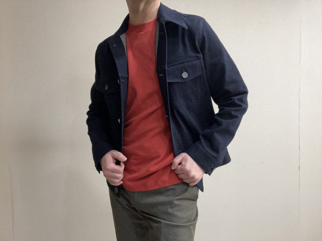 この生地は12オンスというGジャン向けの肉厚感のあるストレッチデニムを使っていますので、羽織りものらしい感じになっています。