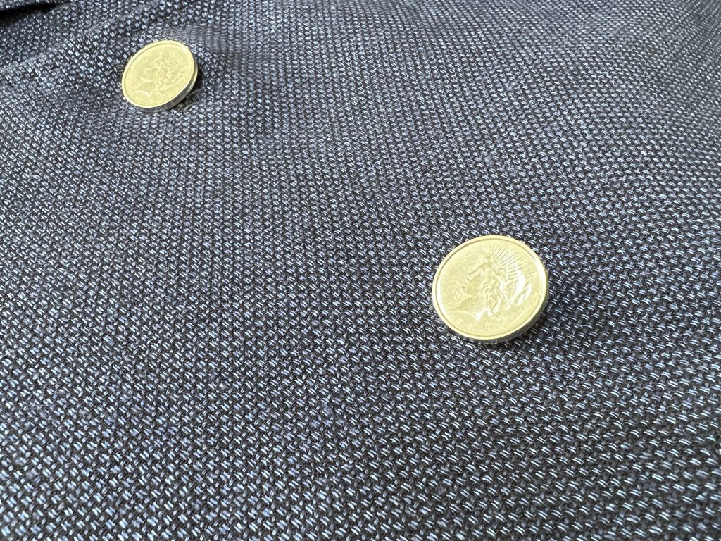 このジャケットにコイン調のメタルボタンを付けるとこのスタイルになります。