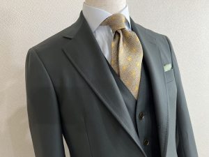 スーツはオールシーズン生地で冬はコートを羽織る。