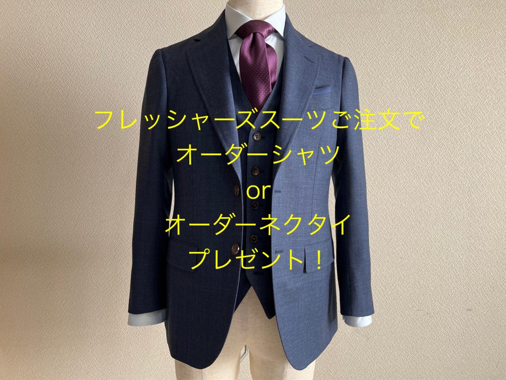 詳細:オーダースーツをご注文頂きますと、9,900円(税込)までのオーダーシャツまたはオーダーネクタイのいずれか一点をプレゼントいたします。