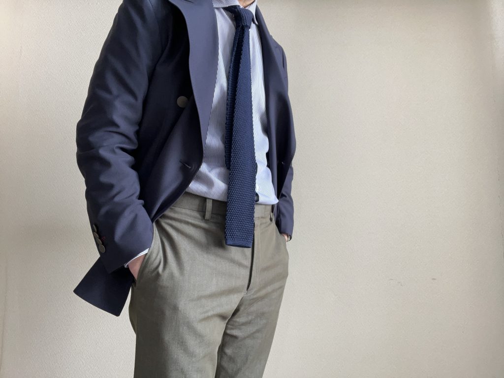 タイドアップもよし、ノータイもよし、そしてインナーはシャツではなくてカットソーでもしっくりくるようにしています。