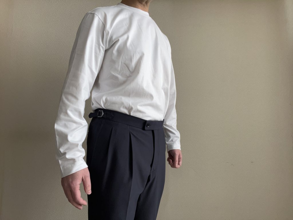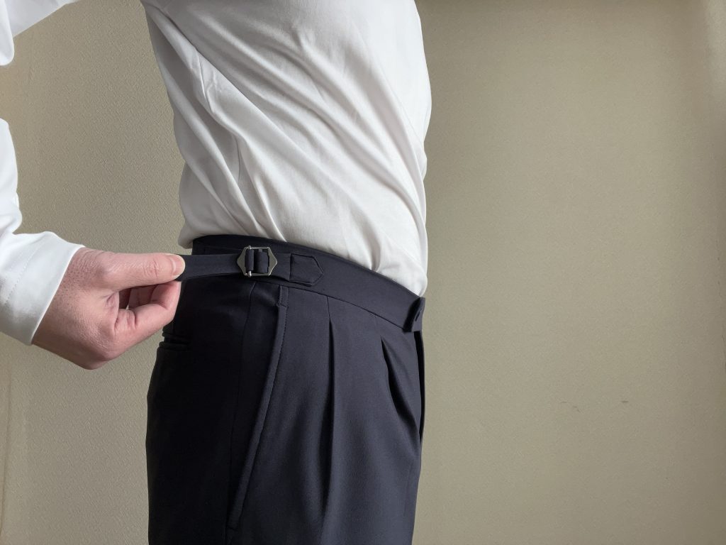 そのパンツですが、ベルトレスのサイド尾錠仕様にしてよりスッキリ魅せるようにしました。