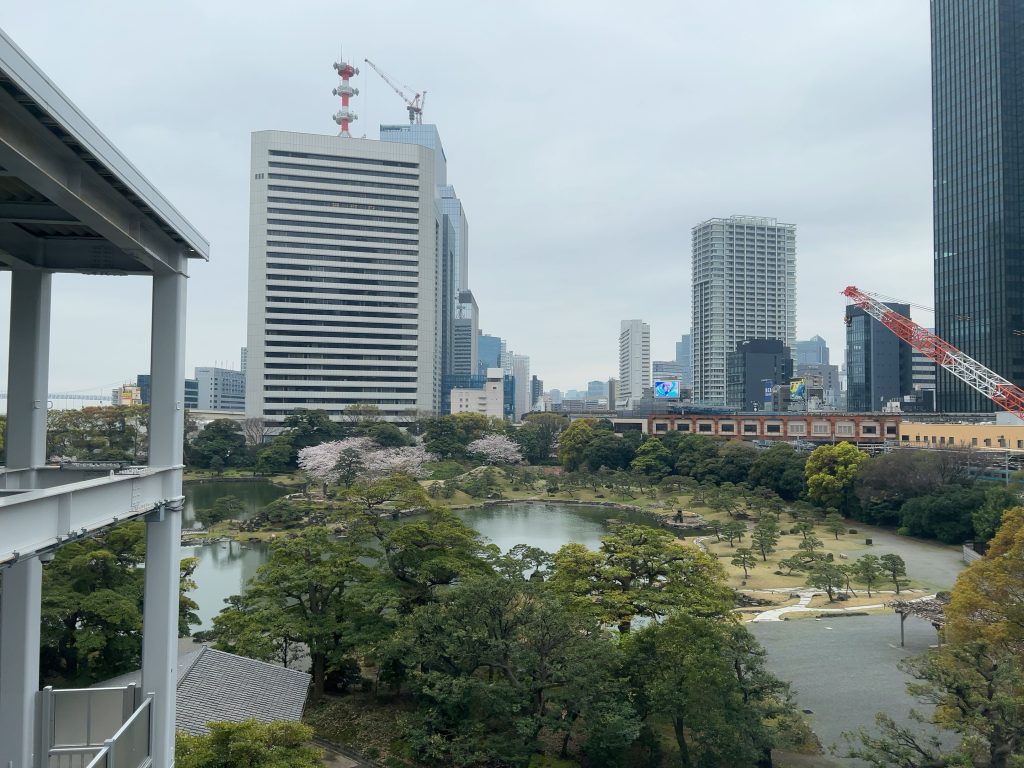 再開発が進む浜松町駅南のペデストリアンデッキより芝離宮を望む