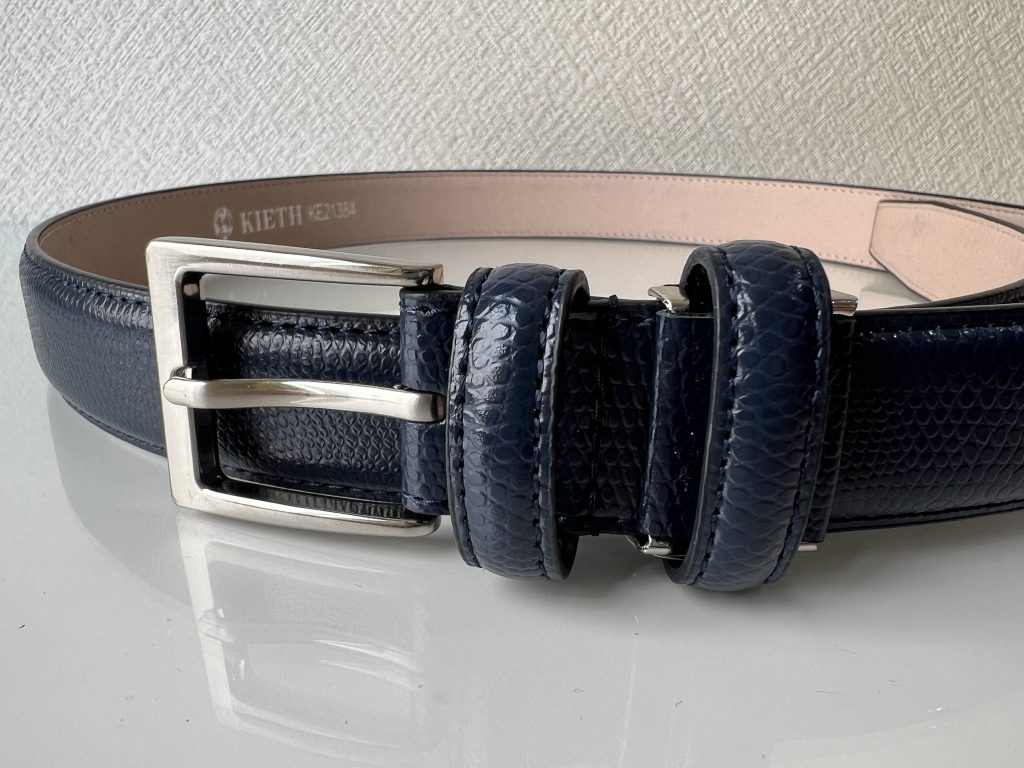 幅28mmのクロコ調型押しのネイビーカラー、どのベルトも裏側は豚革でひび割れは起きにくくしっとりとしています