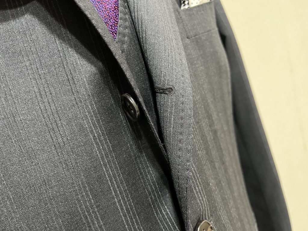 画像のようにラペルの裏側に隠れるようにしてつけてある三つボタンスーツが現代の主流になっています。