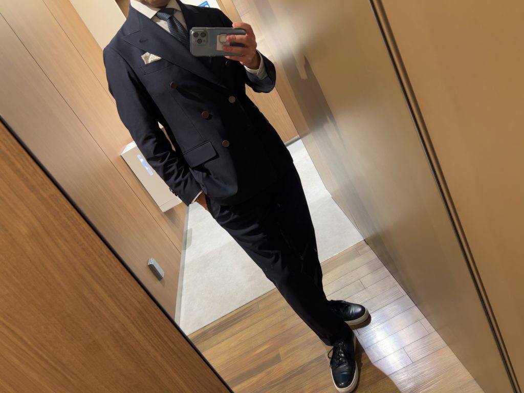 セットアップスーツを揃える時はシューズをレザースニーカーにするだけでグッといい感じになりますね