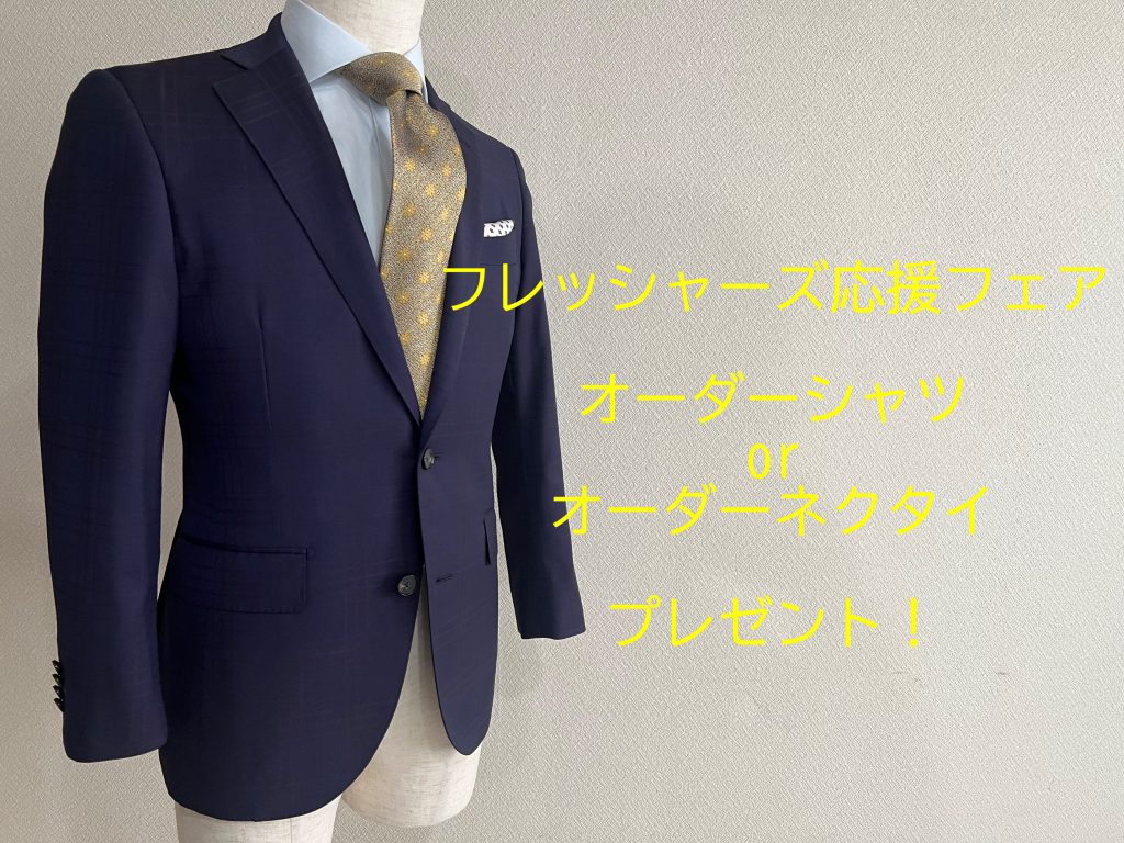 期間中フレッシャーズ対象の方がオーダースーツをご注文頂きますと、9,900円(税込)までのオーダーシャツまたはオーダーネクタイのいずれか一点をプレゼント!