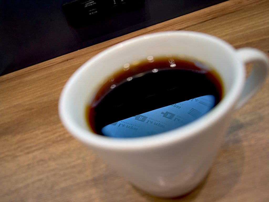 そのカップに注がれたコーヒーにガラスに貼り付けられていたお店のロゴが移りこんでいました。