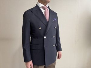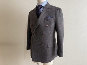 ウールリネン素材で夏でもダブルジャケットを楽しめる